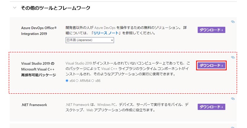 以下のURLからお使いの環境にあった「Visual Studio 2019 の Microsoft Visual C++ 再頒布可能パッケージ」をダウンロードして、インストールしてください。